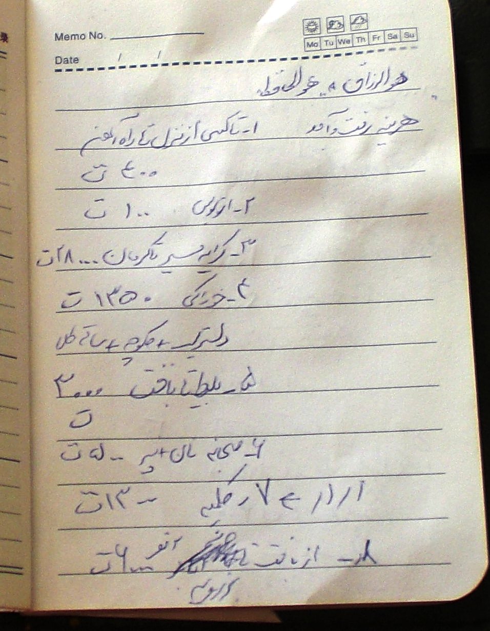 (صفحهای از دفترچه کوچک خاطرات سفر، که قسمتی از لیست هزینهها قابل مشاهده است!)